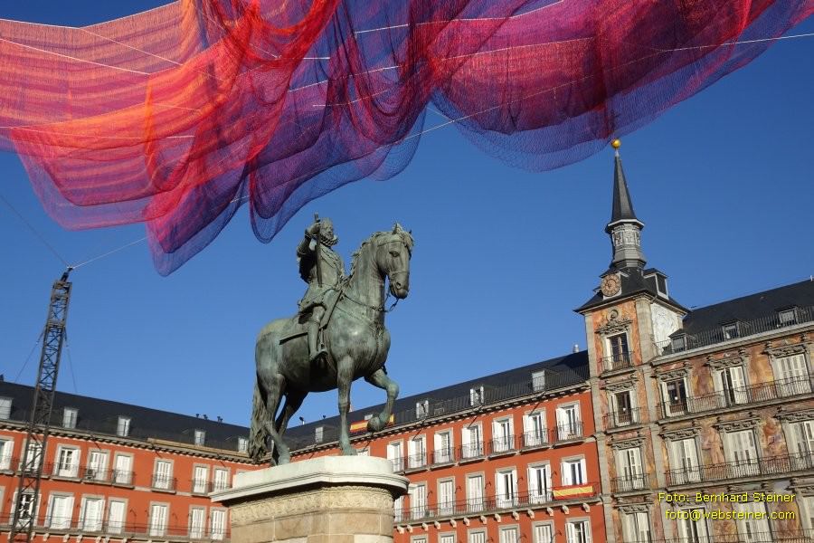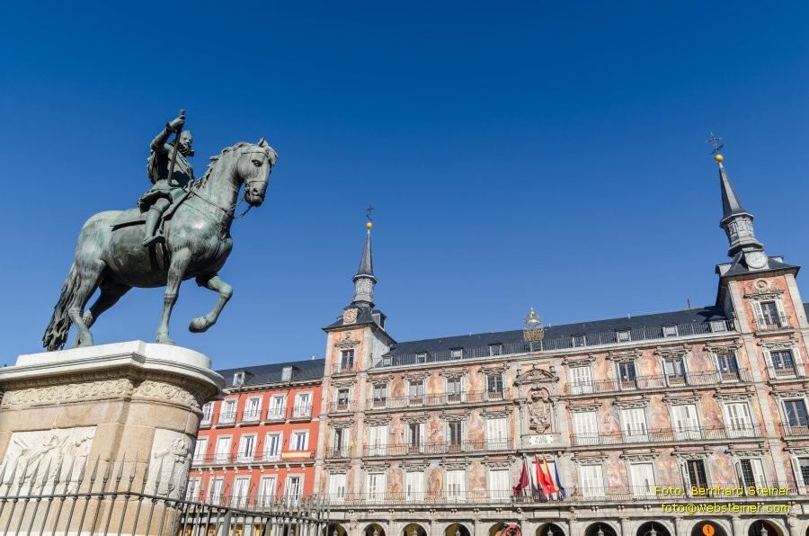 Philipp IV. (1605 - 1665) war ein spanischer Monarch aus dem Haus Habsburg (Casa de Austria). Die Reiterstatue ist von 1640, der prächtige Brunnen darunter von 1845.