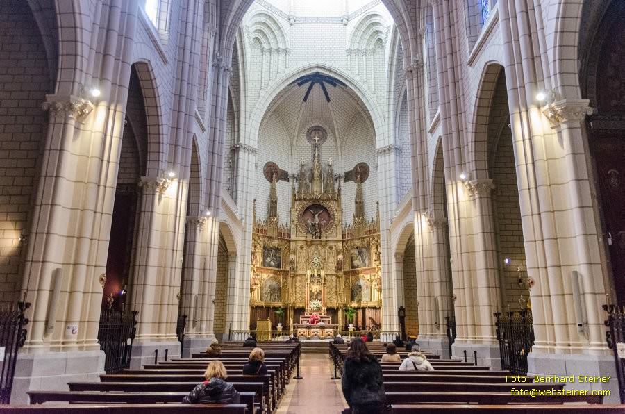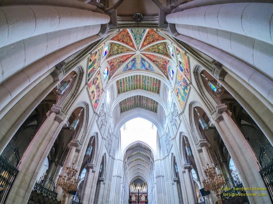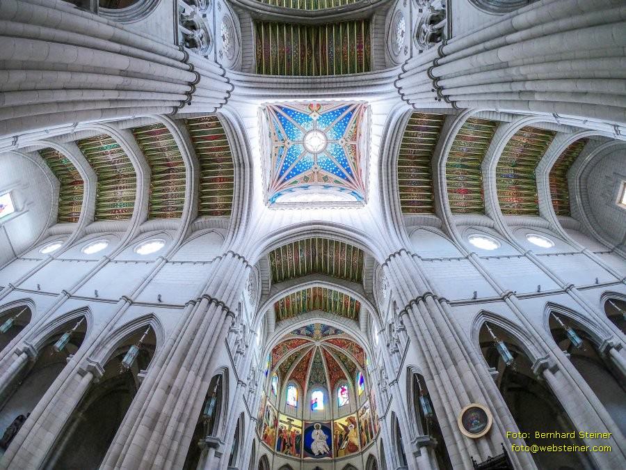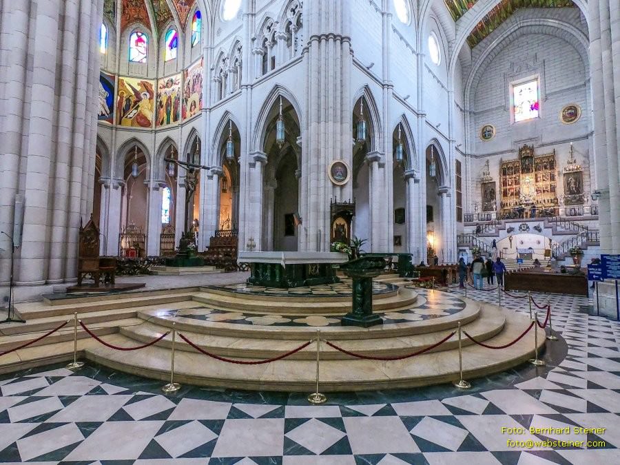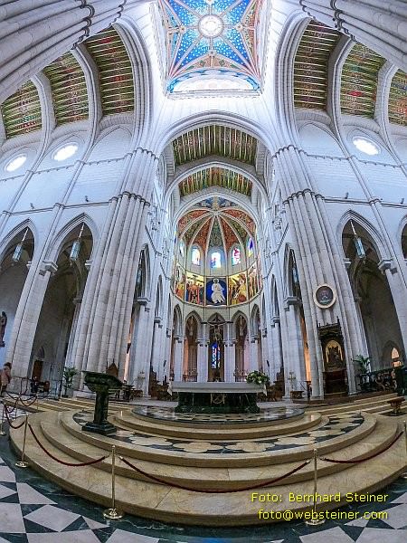 Obwohl die Kirche im neugotischen Stil begonnen wurde, errichtete man die Kathedrale schließlich im Stil des Neoklassizismus, um stilistisch zum angrenzenden Königspalast zu passen. Das Innere der Almudena-Kathedrale ist einzigartig modern, mit einem 'Pop-Art'-Dekor, vom Ikonenmaler Kiko Argüello gestaltet. Der Altar ist direkt unter der Ausmalung der Vierungskuppel und diese somit nicht fürs Foto geometrisch zentrierbar.