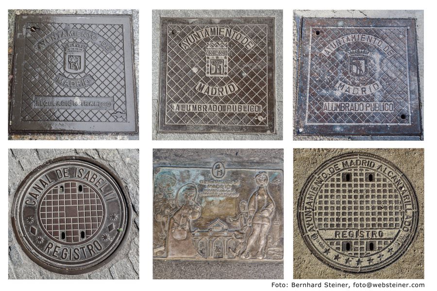 Wer aufmerksam durch das Zentrum spaziert, wird die unterschiedliche Ausprägung der Kanaldeckel bemerken. Sogar hier scheint das Wahrzeichen Madrids als beliebtes Motiv auf.