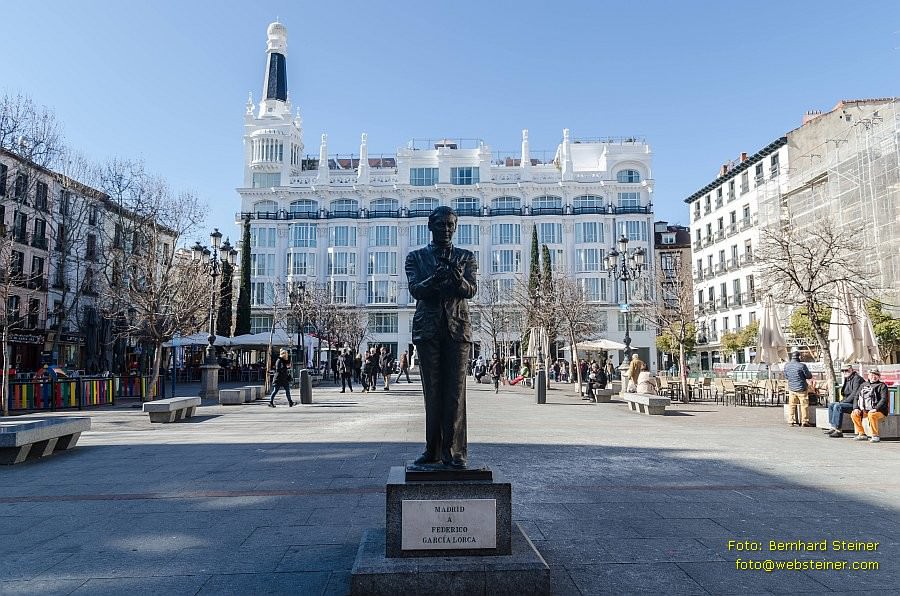 Die Bronzestatue von Federico García Lorca repräsentiert die lebensgroße Figur des Poeten und Dramatikers aus Granada. Er steht, in eine Anzugjacke gekleidet, und hält in seinen Händen eine Lerche bereit, um für das Spanische Theater abzuheben.