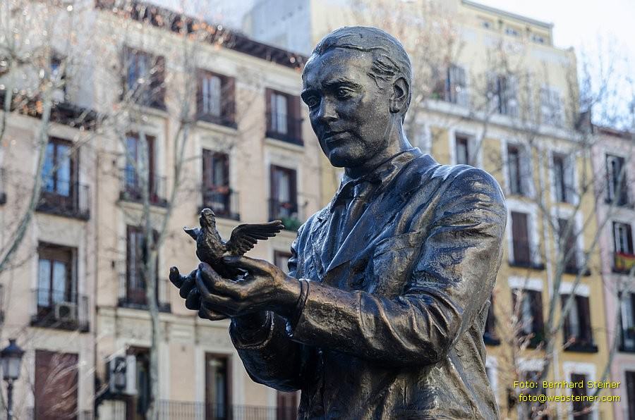 Hier steht die Estatua "Madrid a Federico García Lorca", eine Skulptur von Garcia Lorca, Dichter und Dramatiker des zwanzigsten Jahrhunderts - erschaffen zwischen 1984 und 1986 vom Bildhauer Julio López.