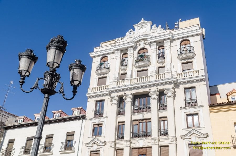 Das ist der Plaza de la Provincia mit dem 'Ministerio de Asuntos Exteriores y de Cooperacion'. Links neigt sich der Turm der Iglesia Santa Cruz ins Bild.
