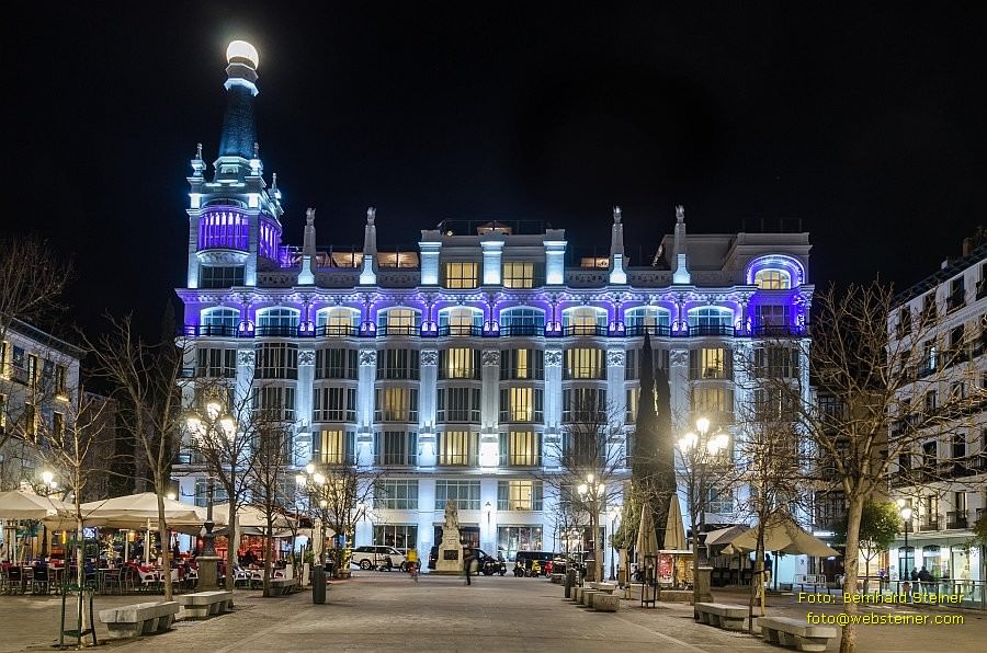 Der Platz sieht auch nachts nett aus. Vor dem Luxushotel 'ME Madrid Reina Victoria' steht das Monument von Pedro Calderón de la Barca (1600 - 1681), ein Dramatiker, Dichter und Schriftsteller des spanischen Goldenen Zeitalters.