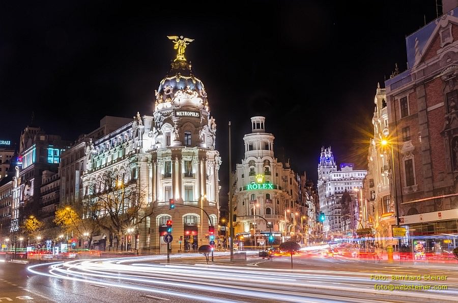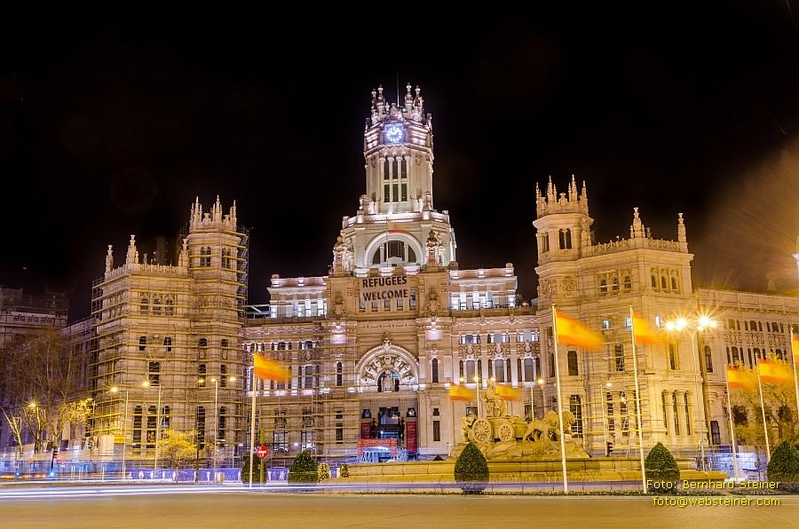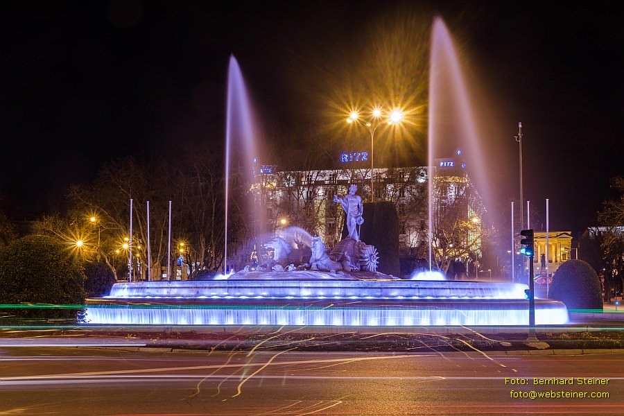 Der viele Autoverkehr verlangt geradezu danach, den Platz in der Nacht mit seinen Lichtspuren zu verewigen. Im Hintergrund ist der Palacio de Comunicaciones, das ehemalige Hauptpostgebäude, das seit Ende 2007 Sitz der Stadtverwaltung von Madrid ist und 2011 in Palacio de Cibeles umbenannt wurde.