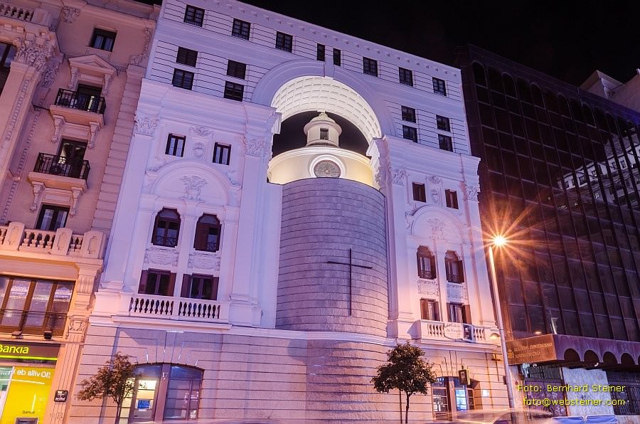 An der Gran Vía 17 ist die Rückseite des 'Real Oratorio del Caballero de Gracia' zu sehen. Der Entwurf der Fassade an die Gran Vía - zwei symmetrischen Körper und ein großes Fenster in der Mitte - stammt von dem Architekten Carlos Luque aus dem Jahr 1916.