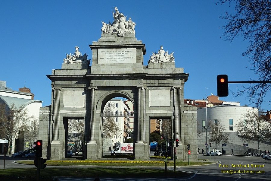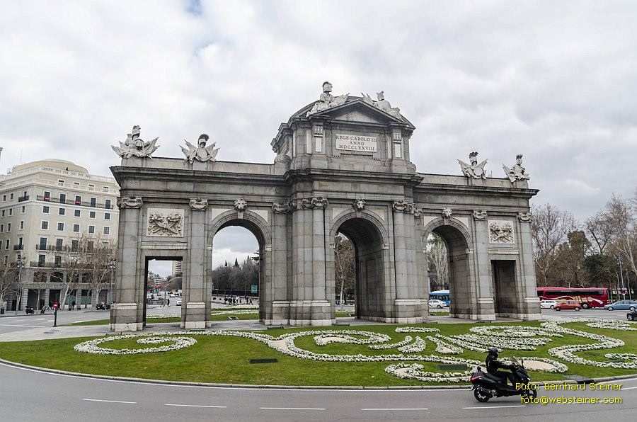 Die Puerta de Alcalá (Alcalá-Tor) ist an der Plaza de la Independencia (Unabhängigkeitsplatz) befindet. In unmittelbarer Nähe befindet sich der Eingang zum Retiropark. Der ca. 44 Meter breite und 22 Meter hohe Torbau wurde von König Karl III. in Auftrag gegeben und 1778 eingeweiht. Der Bogen hat fünf Maueröffnungen (drei Bögen für Fuhrwerke und zwei Fußgängertore), in denen sich früher jeweils Gitter befanden (die eigentlichen Tore), die jeden Tag um die Abendzeit verschlossen wurden. In der Mitte auf der Attika befindet sich ein Stein mit folgender lateinischer Inschrift: 'Karl III. Jahr 1778'.