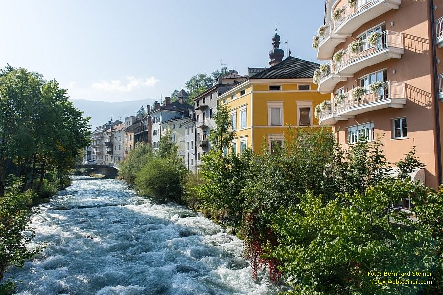 Blick auf die Tielt-Promenade und die Rienz. 1256 n. Chr. erstmals urkundlich erwähnt, ist Bruneck heute der Hauptort des Pustertales und mit über 16.000 Einwohnern die fünftgrößte Stadt Südtirols.