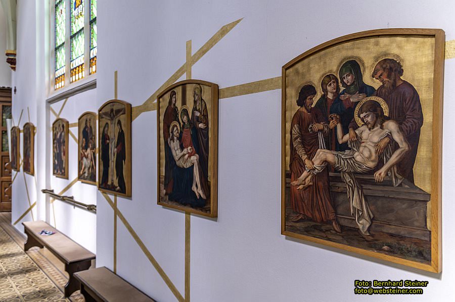 Auch der Kreuzweg wurde in die künstlerische Neugestaltung des Kirchenraums durch Katarina Matiasek einbezogen. Die einzelnen Stationen wurden näher aneinandergerückt, die Balken des Kreuzes mit goldenen Linien an der Wand überjedes Bild hinaus verlängert. Das so entstandene Liniengeflecht löst sich bei den zwei letzten Stationen auf.