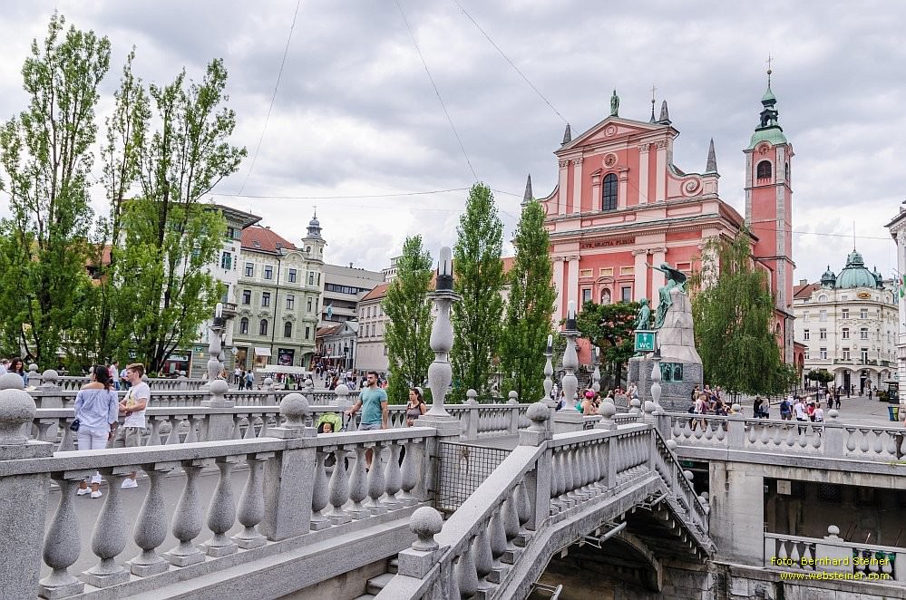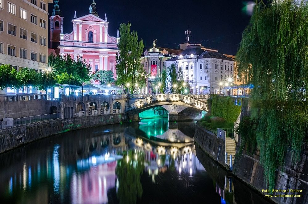 Tromostovje (Drei Brücken) mit der Franziskanerkirche (Franciskanska cerkev).