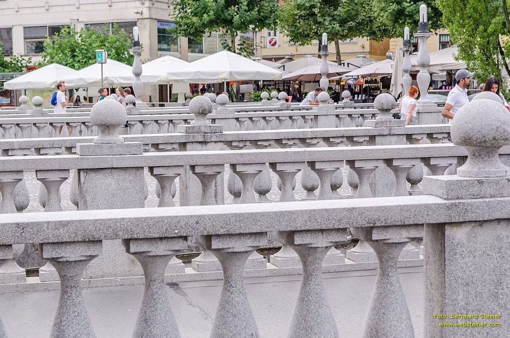Der Novi trg mit seinem Brunnen (Vodnjak na Novem trgu) von der anderen Uferseite.