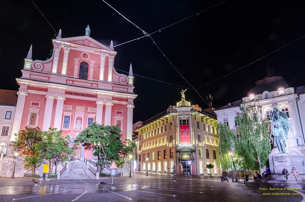 In der Mitte des Preserenplatzes (Presernov trg) steht die Statue des slowenischen Nationaldichters France Preseren. Im Norden des Platzes befindet sich die barocke Franziskanerkirche (Franciskanska cerkev Marijinega oznanenja oder einfach Franciskanska cerkev) sowie das Urbanc-Haus aus dem Jahre 1903.