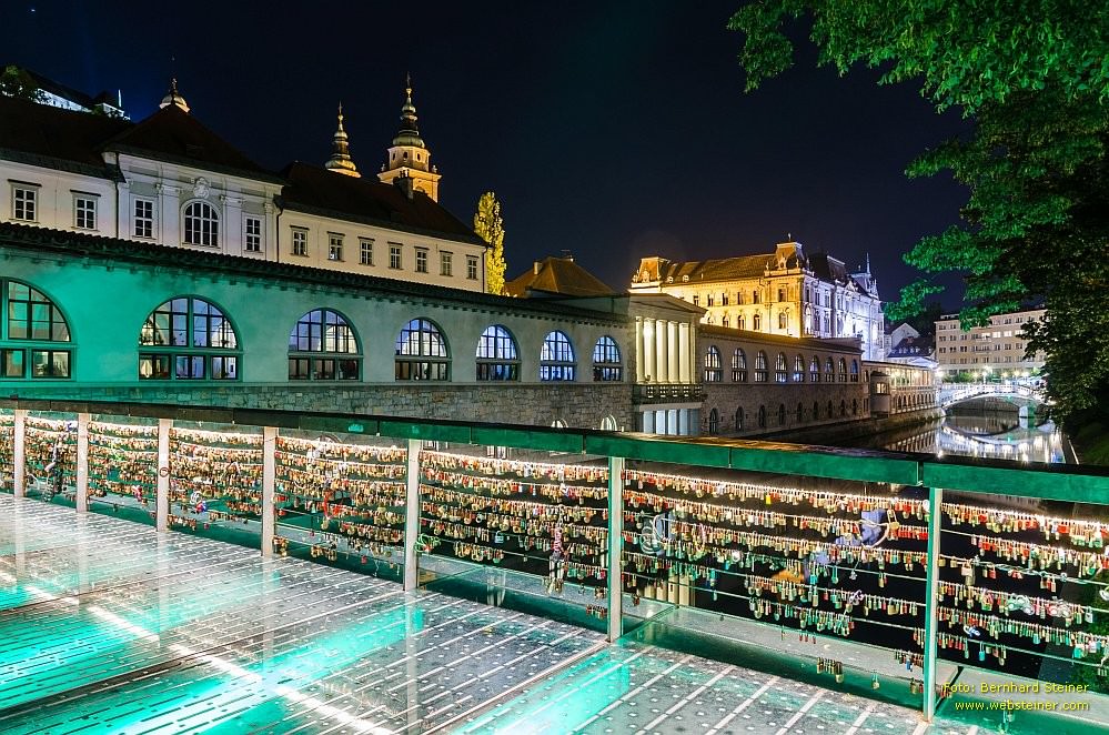 Metzgerbrücke (Mesarski most) mit den Liebesschlössern mit Blick auf Tromostovje, links die Plecnik Arkaden (Plecnikove arkade). Die Stadt ist berühmt für ihre von Joze Plecnik geplanten Architekturdenkmäler - ein slowenischer Architekt, der in Wien, Prag und Laibach wirkte - sowie für ihre gut erhaltene Innenstadt.