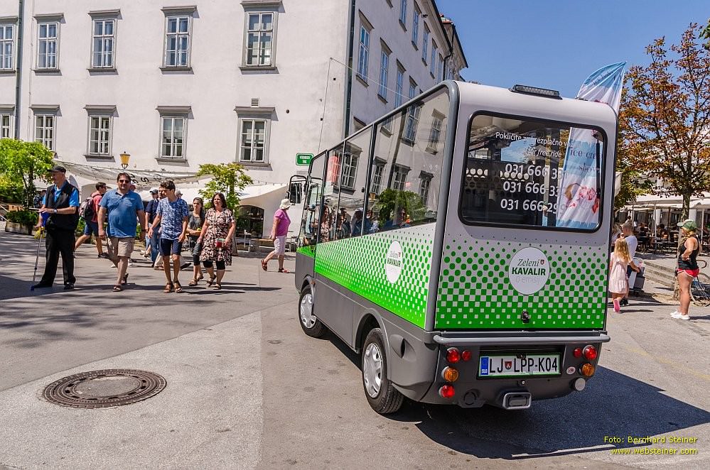 Der 'Kavalir', ein Fahrzeug mit Elektroantrieb, ist ein menschen- und umweltfreundliches Konzept kostenloser Stadtbeförderungen in Ljubljana. Die in der Fußgängerzone des Altstadtkerns fahrenden Kavaliere sind vor allem für ältere Bürger, bewegungsbehinderte Menschen und Touristen bestimmt. Wegen der niedrigen Geschwindigkeit kann man einen Kavalier während seiner Fahrt anhalten und einsteigen.