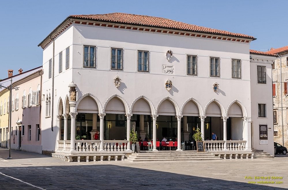 Der Loggia Palast (Palazzo della Loggia) ist ein venezianischer gotischer Palast und das einzige erhaltene gotische Rathaus in Slowenien. Das Loggia caffe kavarna heißt zahlende Gäste gerne willkommen.