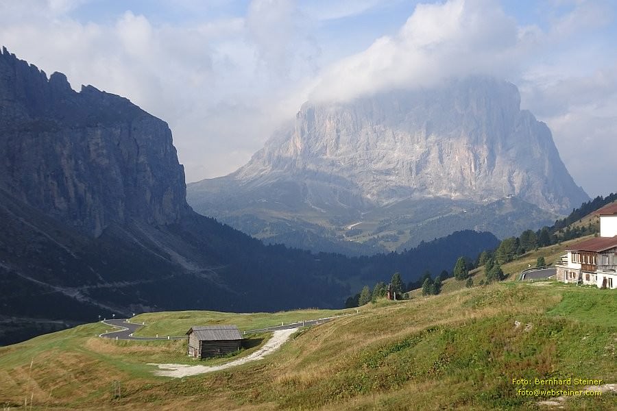 Der Langkofel ist der Hauptgipfel der Langkofelgruppe in den Grödner Dolomiten und ein bekannter Kletterberg. Der Name Langkofel (ladinisch Saslonch, ital.: Sassolungo) bedeutet 'Langer Stein/Fels'. Der Klotz ist 3181 Meter und über einen Kilometer breit. Hier von Nordosten aus gesehen.