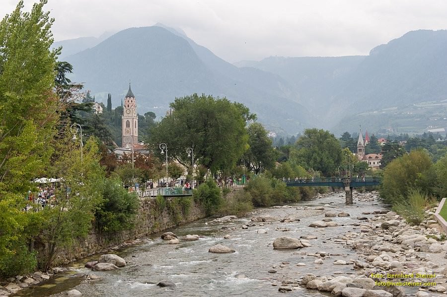 In Meran mündet die Passer in die Etsch. Rechts ist der Kirchturm von St. Nikolaus zu sehen.