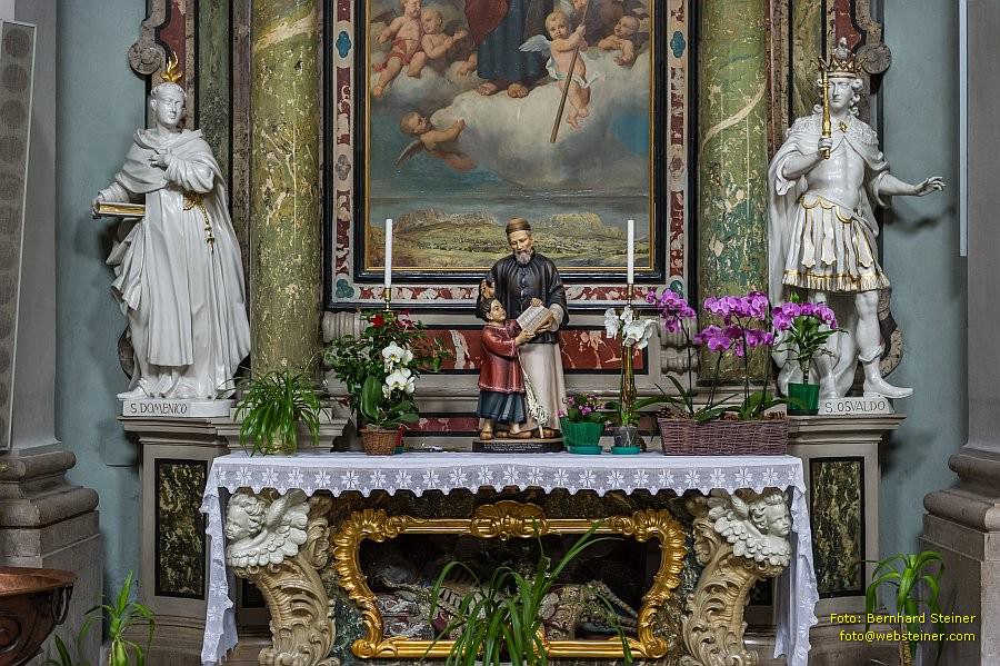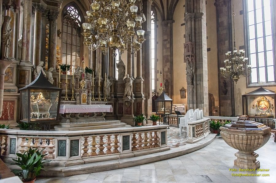 Mit dem gotischen Hallenraum kontrastiert der barocke, 1716 vom Veroneser Architekten Ranghieri errichtete, monumentale Hochaltar aus Marmor mit seinen vielen Säulen und Heiligenfiguren.